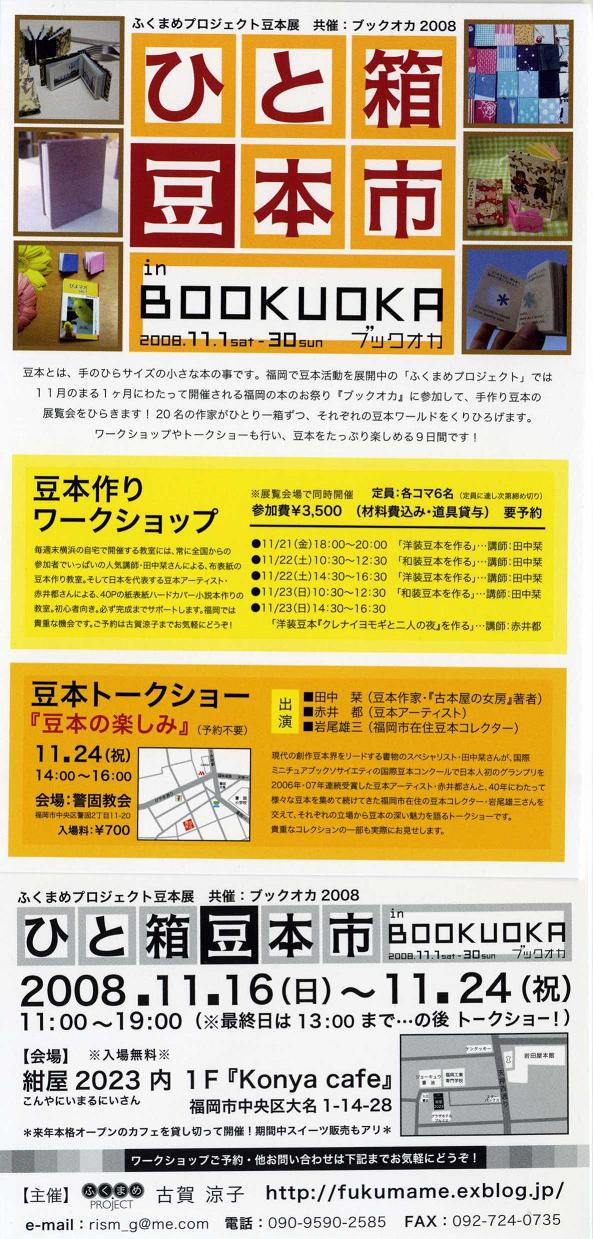 昨日、発送しました。 画像用のブログにひと箱と新作をUPしています。 良かったら、ご覧下さい(右上のリンクからも飛べます)。 http://kobitodo.exblog.jp/ これから会場で配布していただく「小人堂型録」を作ります。 もう、何もかもがギリギリです。 計画性と実行力が欲しいです(切実)。 11月16(日)〜24(月・祝)に福岡市で開催される ふくまめプロジェクト豆本展『ひと箱豆本市』in BOOKUOKA 2008 という、豆本市に出品することになりました。 豆本フェスタで張り切って作ったので、殆どはそこから出品する予定です。 新作もいくつか出せたらな~と思っていますが、どうなるかは未定です。 だって、締め切りまで1ヶ月を切っているのですもの。 目途がついたら、またご連絡致します。 イベントの詳細はふくまめプロジェクトをご覧下さい。 画像ブログにもUPしておりますので、良かったらそちらもご覧下さい。 ふくまめプロジェクト http://fukumame.exblog.jp/ 覚え書(小人堂の画像ブログ) http://kobitodo.exblog.jp/ ※右上のリンクからも飛べます。