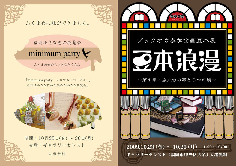 × [PR]上記の広告は3ヶ月以上新規記事投稿のないブログに表示されています。新しい記事を書く事で広告が消えます。 今週金曜日から開催される豆本展とミニチュア展に参加します。 豆本浪漫にちなんで、小人堂の店主・大きな小人が浪漫を感じる街 ヴェネツィアを扱った豆本を出品しています。 ブックオカ参加企画豆本展 「豆本浪漫」〜第1章・旅立ちの扉と3つの鍵〜 日時:2009.10.23(金)〜10.26(月) 11:00~19:00 会場:ギャラリーセレスト 会期中の土日には田中栞先生のワークショップも予定されています。 従来の初心者向けの講座に加え、それではちょっと物足りなくなった方への 中級クラスの講座もあります。 大人気のガチャポンもありますよ。 同時開催のminimum partyにもちょっぴり参加しております。 良かったら遊びに来て下さい。 皆様のご来場を心よりお待ち申し上げております。 詳細はふくまめプロジェクトで、会場はギャラリーセレストでご確認下さい。 小人堂の出品は右上のリンクから画像ブログに飛んでご覧下さい。 PR お知らせするのが大変遅くなりましたが、今月福岡市で開催される 豆本展「ふくまめ2」に出品する予定です。 ★『福岡の手作り豆本展 ふくまめ2』★ 会期:2009年4月16日(木)〜4月26日(日) 11:00〜19:00(最終日は20:00) 会場:ギャラリー天神アートフレンズ そして、何と4月18日(日)に先生デビューをさせていただくことに なりました。 新米先生なので、非常にドキドキしております。 私が担当するのは蛇腹折の豆本です。 この日の午後には消しゴムはんこのワークショップもあって、 出来た本に参加者全員ではんこを押し合うという楽しいイベントです。 はんこを教えてくださるみな先生の作品もとても素敵なので、 オススメです。 会期中、お近くにお出向きの折は、是非是非お立ち寄り下さい。 かわいい世界が待っていますよ。 詳細は公式ブログでご確認下さいね。 ふくまめプロジェクト公式ブログ http://fukumame.exblog.jp/ 尚、右上のリンク先の小人堂の画像ブログにふくまめ2の情報を 順次UPしております。 ガチャポンに登場予定の「GATTO」の姉妹品のプレゼントも 実施しております。 良かったら、そちらもご覧頂けると嬉しいです。
