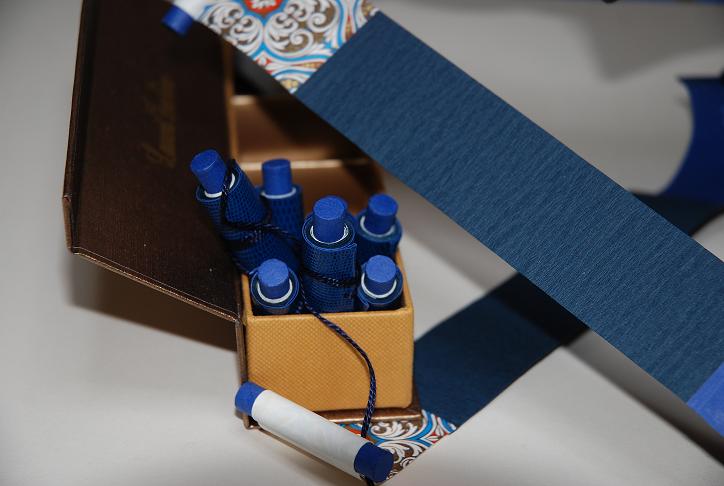 全部で12種類。 多いのか少ないのか、いまひとつ分からない。 申し込んだ時は、5種類50冊を目標にしていたので、 その点は目標を達成した。 しかし、やりたかったことの半分もできなかった。 圧倒的に技術が足りない。 反省点ばかりが目に付く。 もっと勉強が必要だ。 残念ながら、現段階ではこれが限界である。 次に向けて、ステップアップしたい。 という訳で、私の豆本道は今しばらく続く予定である。 ※画像はクリックすると大きくなります 「夜の書簡」 洋風の豆巻物、というか、歴史物に出てくるような書簡を目指して 作った筈だったんだけど、仕上がってみたら、和洋折衷である。 表紙の紙を革風にしたつもりが、なんというか、その・・・・・・ 卒業証書の筒のようになってしまった。 いや、これはこれで味があって、私は好きなんだ。 好きなんだけど、これを好きなのが私以外にいるのかは疑問である。 あああ~。 中は紺の無地なので、お好きな文言を書いて頂きたい。 白や銀色のペンで書くと、渋さがぐっと増す。 秘伝の書としても使えるかも。 月のスタンプを押し、星の王子様のチャームをつけている。 静かな夜に、誰かに小さなお手紙をしたためてみてはいかが? ところで、これが最初の撮影で撮り忘れた豆巻物である。 本当は集合写真の中に入れたかったんだけど、並べなおすのが 面倒という理由で断念した。 という訳で、集合写真の右上にでも、貼り付けなきゃいけない(笑)。 |