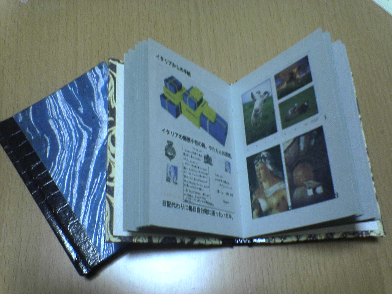 販売会の片隅で「小人堂」(豆本屋)を営業致します。 といっても、ちょびっとだけなのですが。 お近くにお越しの際は、良かったら覗いてやってください。 イタリア旅行で集めた紙を1本に仕立ててみた。 最近、Wordでハガキサイズの半分の本の原稿を作る方法を覚えたので 楽しくて仕方がないのだ。 それを糸で綴じて、角背のハードカバーにしてみた。 初めての試みにしてはうまくいった。 ちゅうか、何でもっとはやく、この方法を試してみなかったのか。 何事も基本が大事だな。 さて、あらかた形ができてくると、問題になるのが中身である。 今更だが、本作りにおいて、中身こそが重要だと改めて気付いた。 本当に今更の話なんだわ。 何の本を作ったらいいのやら・・・。 ああ、私ってば中身のない人間だったのね。 全然関係ないけど、最近拷問を受けている夢を見る。 やっぱり、追い詰められているのかしら。 そんな訳でブログを書くのがとても億劫。 またしばらく更新はない・・・かもしれない。